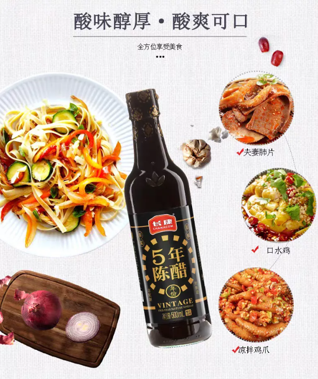 歷經(jīng)5年時光沉淀、1800多個日夜的自然發(fā)酵,長康五年份陳醋,成就了5°黃金酸度,入口溫和不刺激,酸香柔和綿長,可以直接佐餐。