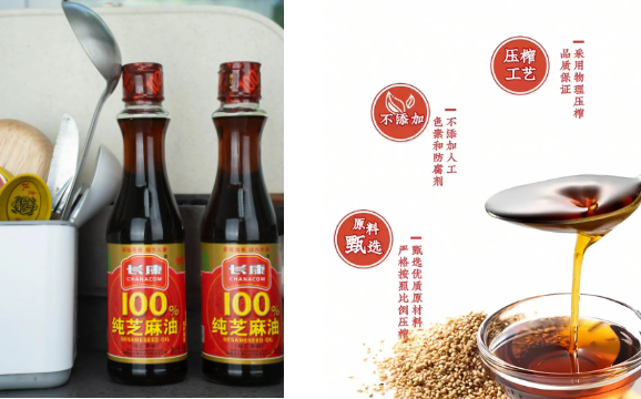 長康100%純芝麻油,選用長康自有綠色食品原料種植基地的當(dāng)季新鮮芝麻,以物理壓榨工藝制成,堅(jiān)持無添加劑、無防腐劑、無香精無色素,配料表只有芝麻一種,滴滴醇香。